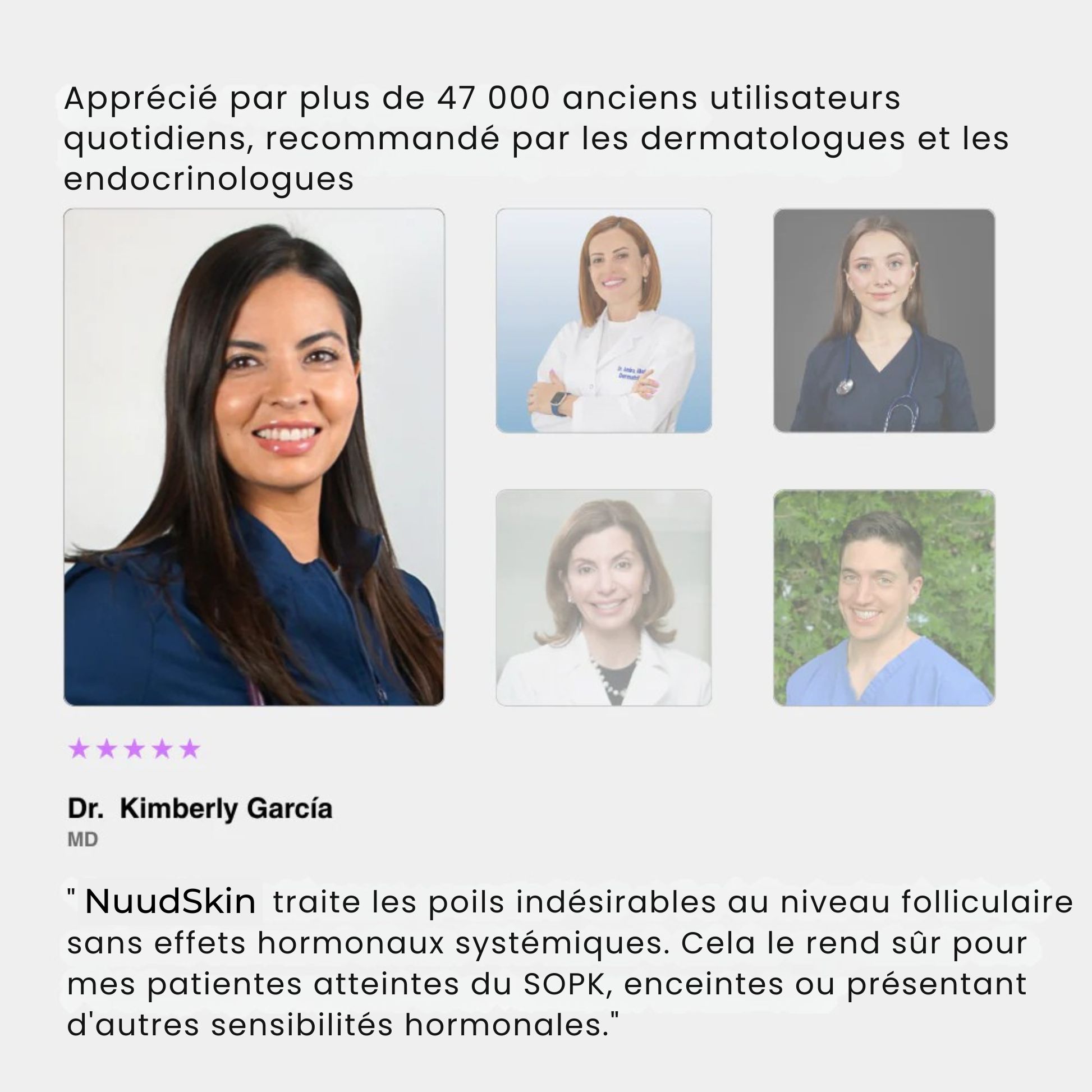 NuudSkin™ est sûr pour les femmes présentant des déséquilibres hormonaux, car il agit localement à la surface de la peau et au niveau des follicules.