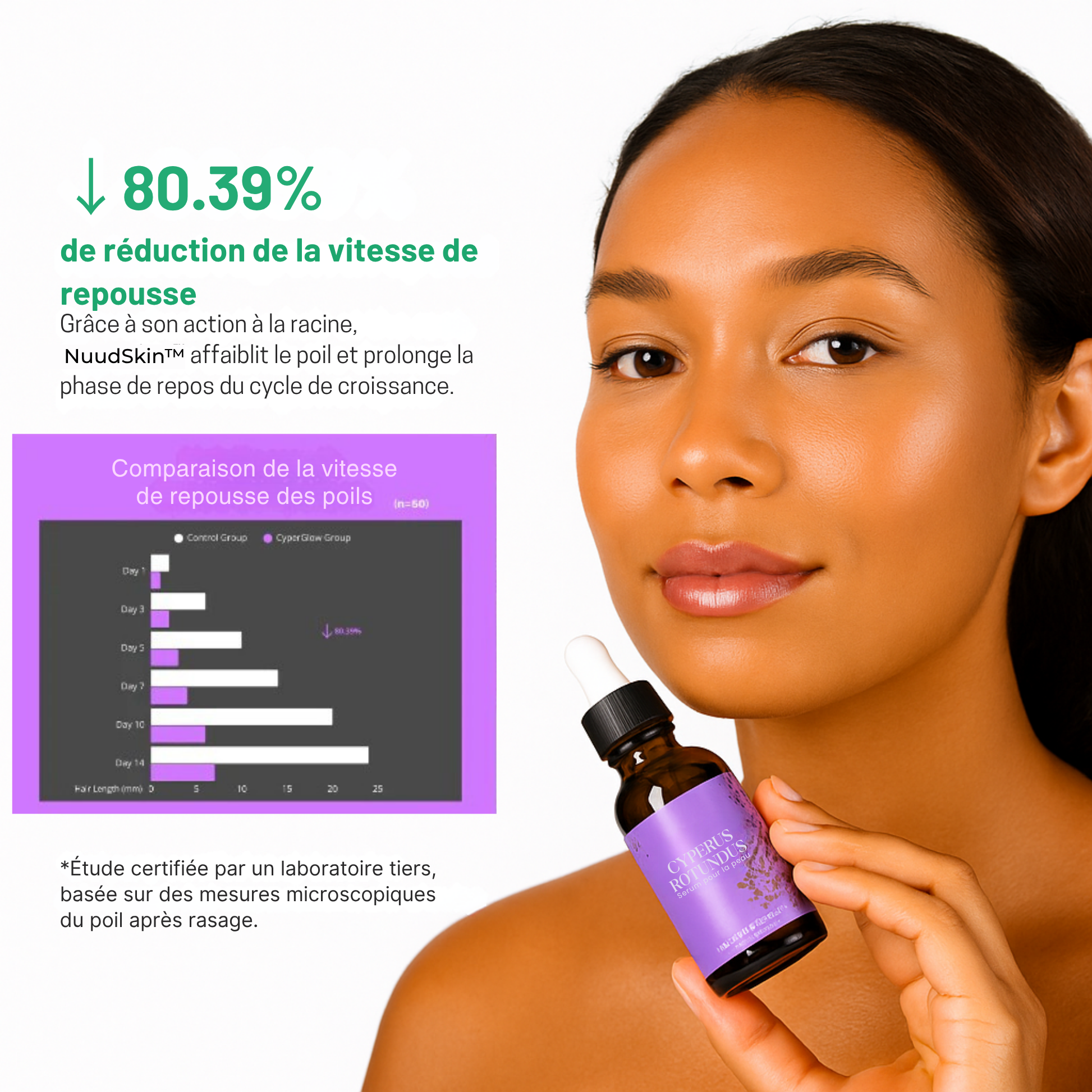 Notre formule avancée à base de Cyperus Rotundus a été cliniquement étudiée pour ses propriétés naturelles d’inhibition de la repousse du poil, faisant de NuudSkin™ l’alternative naturelle que les professionnels de santé recommandent réellement à leurs patientes.
