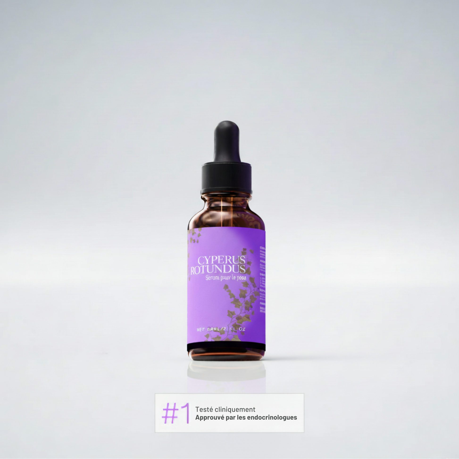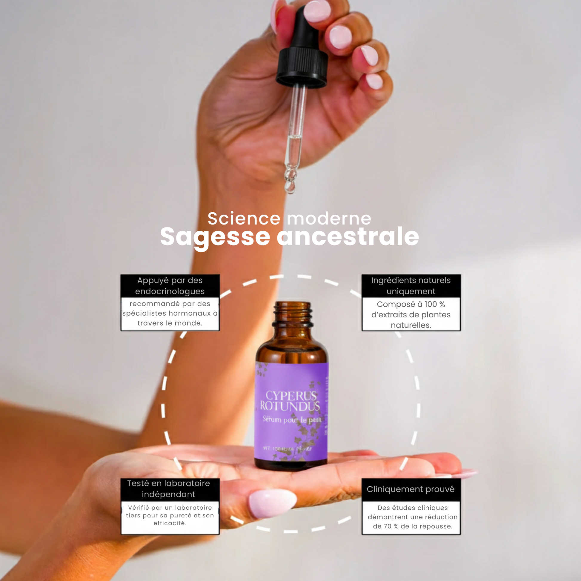 Le sérum cutané au Cyperus Rotundus agit directement sur les follicules pileux grâce à un blocage localisé des androgènes.